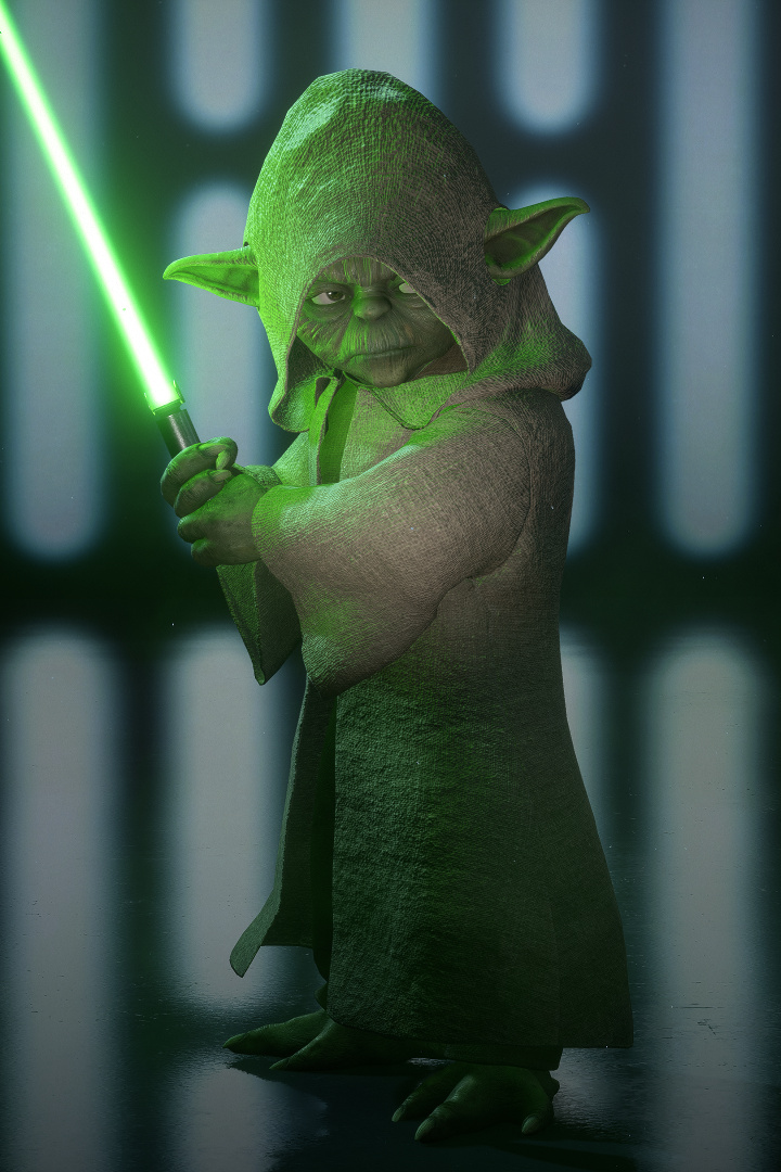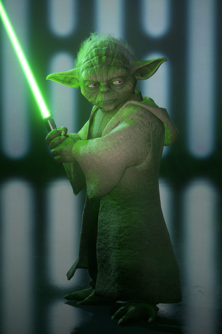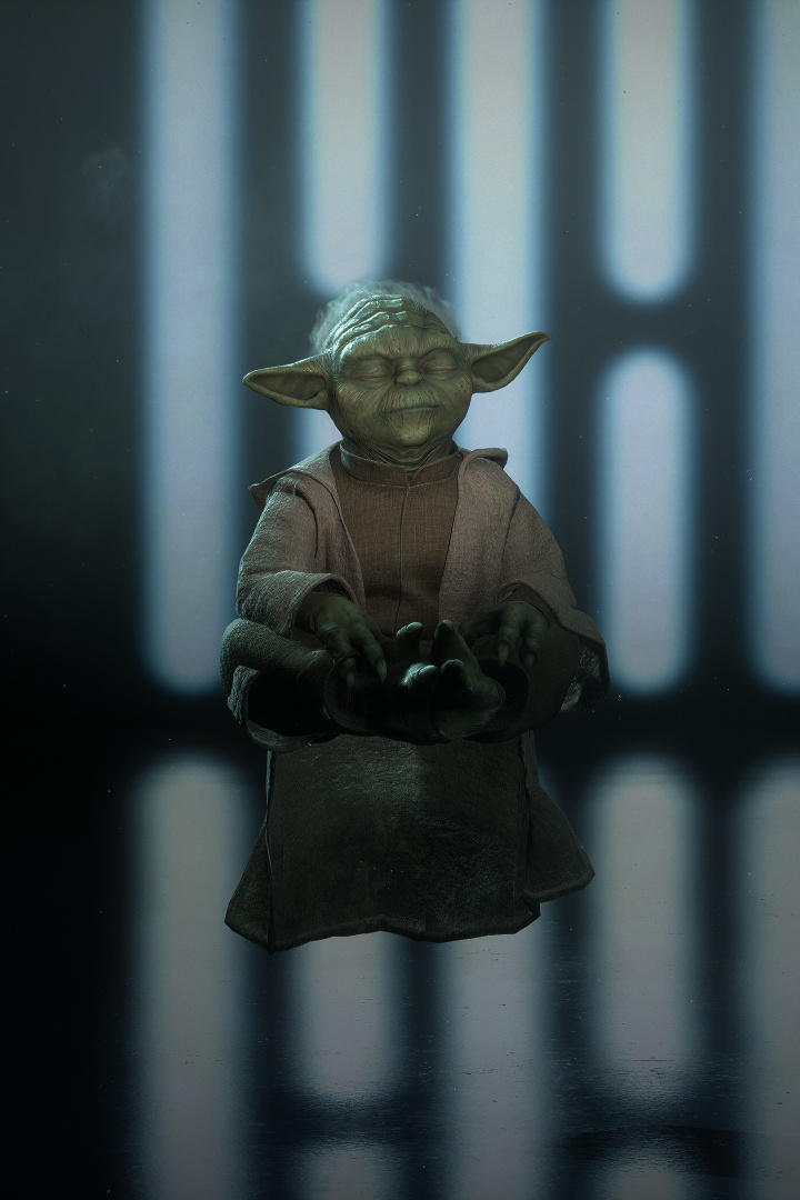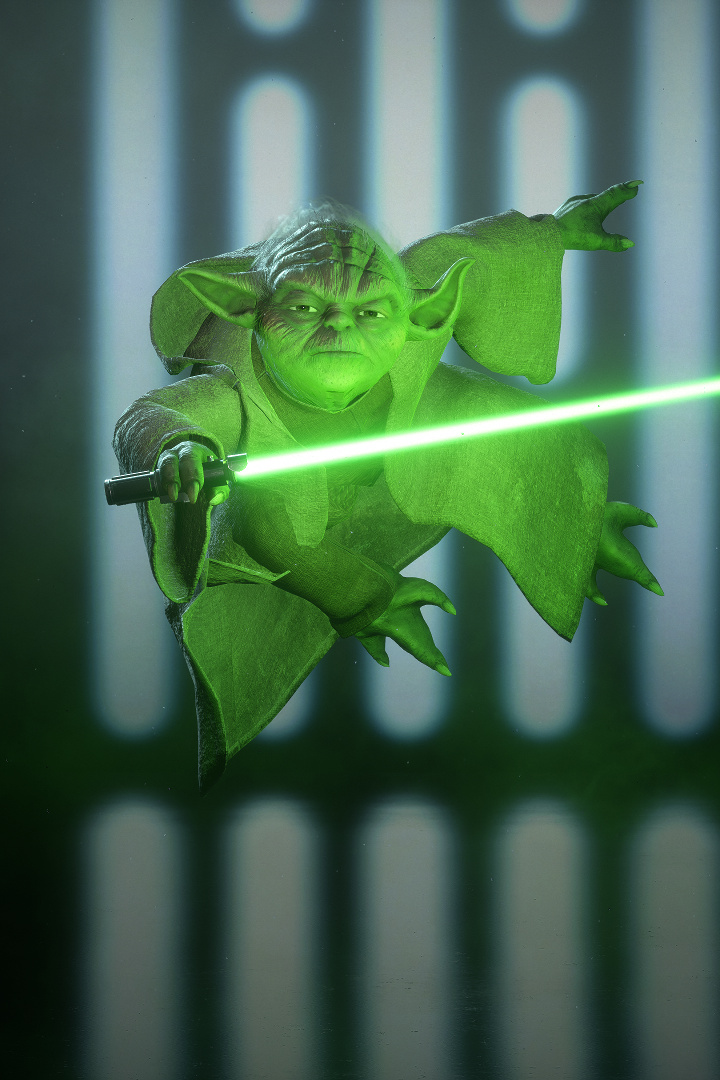 ヨーダは守りの流れを攻めに転じる技を得意とする。ライトセーバーを振るいながら、フォースの力によりブラスターの射撃をはじき返し、さらには敵の攻撃の影響を防ぎつつ、傷を癒すこともできる。
